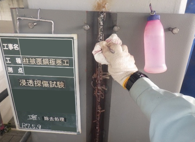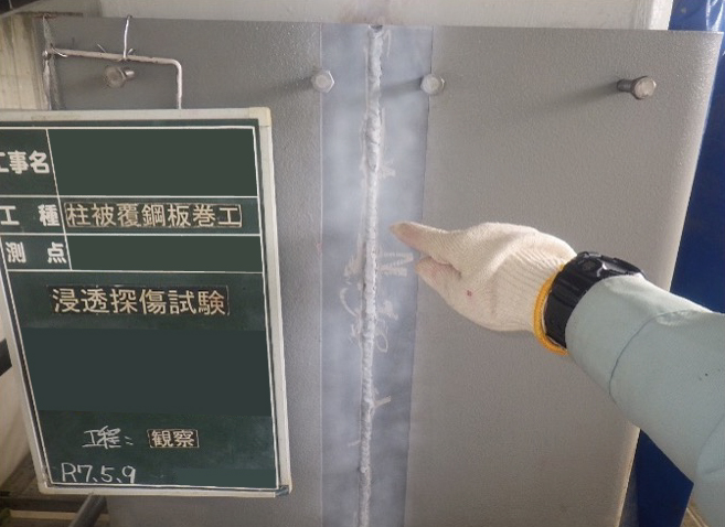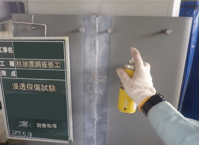 柱補強のための鋼板巻き溶接部の浸透探傷試験を行いました。