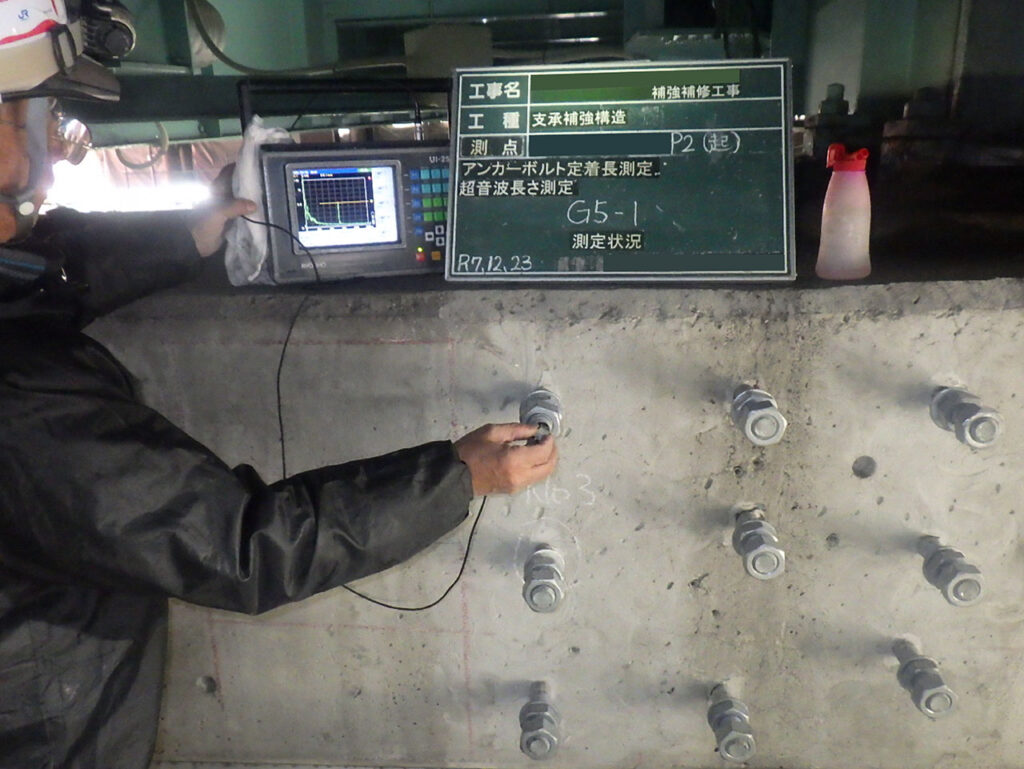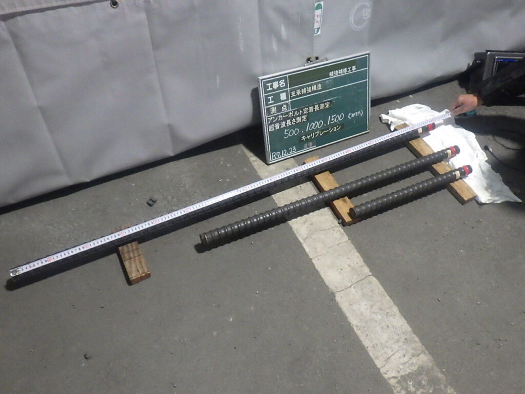 さらに後日、ブラケット固定用アンカーボルト打設後の工事品質試験として「アンカーボルト引張試験」「アンカーボルト定着長測定(超音波長さ測定)」を実施しました。
