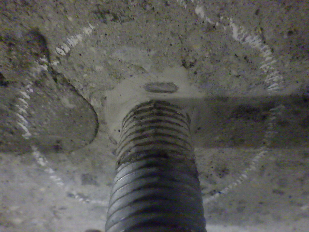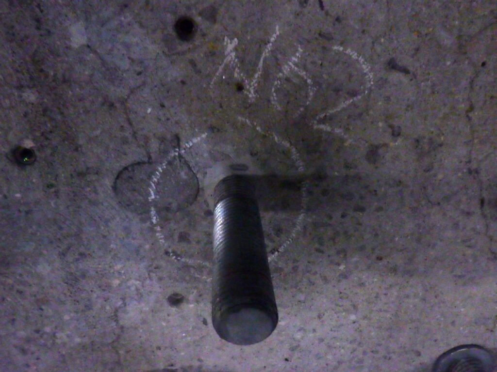 鉄筋探査の後、他社さんが現場に入り、ブラケット固定用のアンカーボルトを打設(コンクリート削孔、あと施工アンカー挿入・定着工事)。