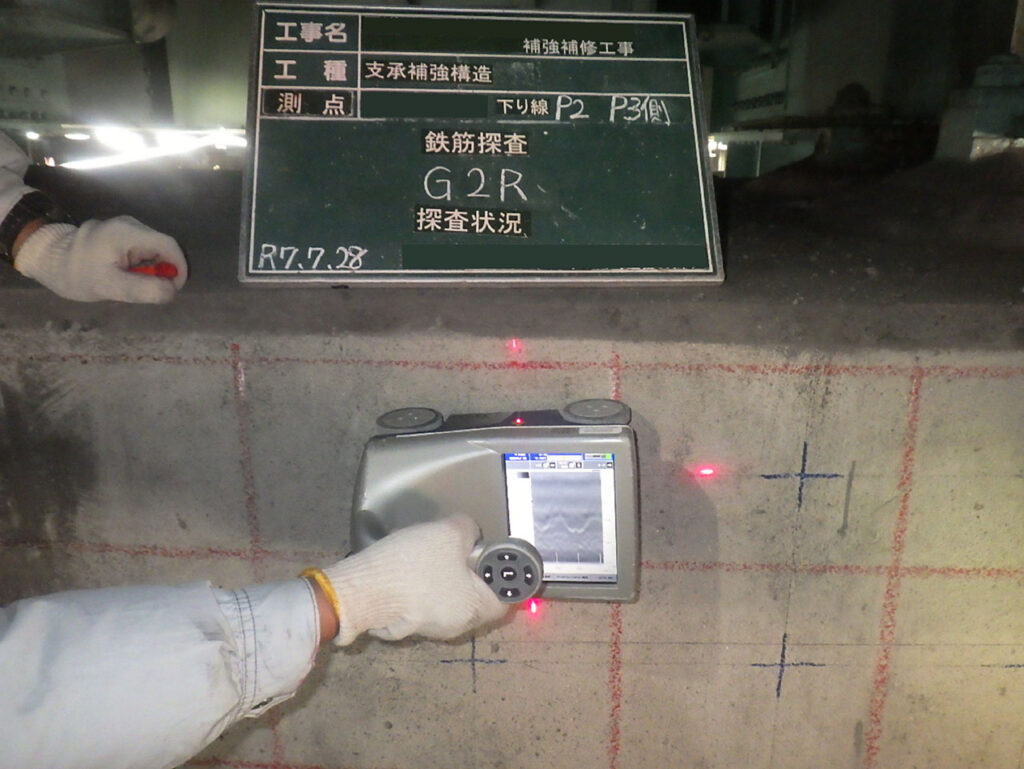 ブラケットは橋梁の下部工(橋を支える橋台や橋脚など)に「あと施工アンカー」と呼ばれるアンカーボルトで固定されます。下部工は鉄筋コンクリート構造ですので、アンカーボルトを打ち込むための削孔の際にコンクリート内部の鉄筋を切断しないよう、事前にコンクリート内部の配筋状態を調査する必要があります。