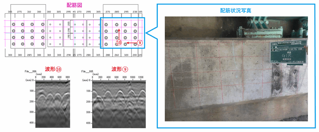 ▼探査箇所の配筋図・配筋状況写真・波形の例(同一箇所)
